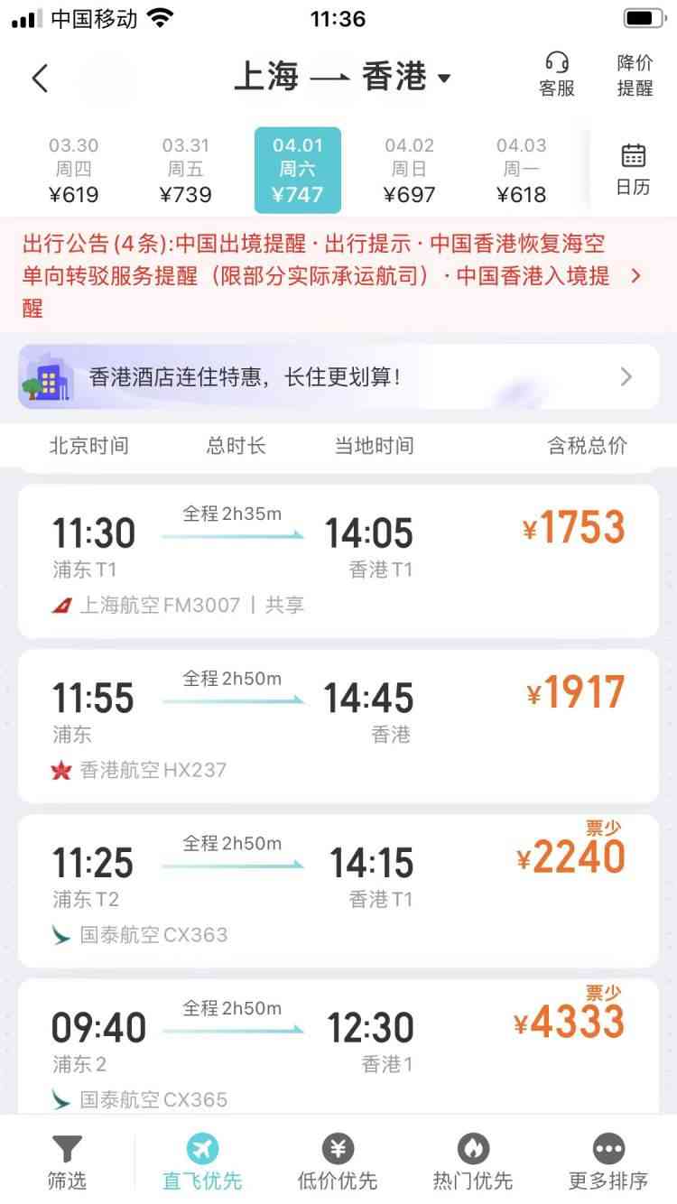 记者查询了从上海飞香港的机票价格,4月1日,较低的票价是厦门航空从虹桥起飞经福州转机的航班,747元;东航有从浦东直飞香港的,票价943元。其他航班的价格大多在1500元至2000元之间。所以,如果单纯从价格来看,买高铁的一等座、二等座,票价比飞机便宜一点。