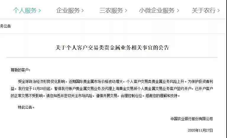 受全球政治经济形势变化影响,贵金属市场价格风险和流动性风险加剧,11月27日,多家国有大行和股份制银行纷纷出手,暂停零售贵金属交易业务新开交易账户。