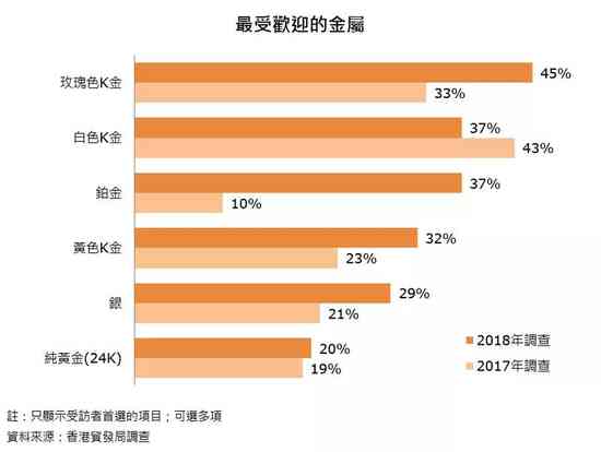 在香港国际珠宝展2018和香港国际钻石、宝石及珍珠展2018举行期间,香港主办方在会场以问卷形式合共访问了1,269名买家及参展商。问卷调查结果显示,2018年K金依然是最受欢迎的贵重金属,当中玫瑰色K金及白色K金最受青睐。此外,铂金的受欢迎程度料会大增。