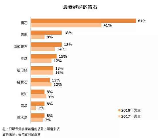 2018年,钻石依然是最受欢迎的宝石,获61%受访者垂青(较去年上升20个百分点)。2018年,选择翡翠、海蓝宝石、珍珠、黄晶及紫水晶的受访者比例都有所上升;不过,选择红宝石及琥珀的受访者比例则稍微减少。