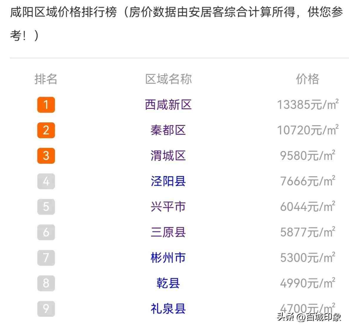 从咸阳的区域房价来看,房价最高的区域是西咸新区,均价1.3万元/㎡左右,西咸新区价位最高的区域是沣东新城,其实和渭城区就隔着1条沣河,而丰西新城、秦汉新城等都比较偏;秦都区和渭城区都是咸阳的老市区,秦都区1.1万元/㎡,渭城区0.95万元/㎡,开车出行很堵,相对来说,价格也不低。当然,实际的成交价格可能略有不同,以上数据仅作为参考。