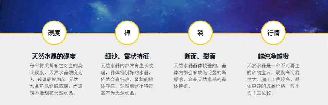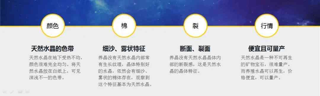 看晶体,养殖水晶的晶体完全纯净,没有一点冰裂棉絮;而天然水晶或多或少会有一些棉裂,不是完美无瑕的。