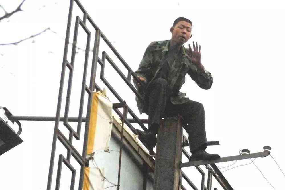 最让人印象深刻的,不是事情的结果,而是无法接受事实的小刘,突然爬上广告牌,声称“不给车我就不下来”。