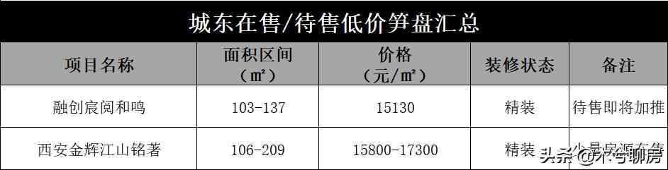 城东板块目前在售/待售项目不多,有:龙湖天耀、红星·天铂、融创宸阅和鸣、西安金辉江山铭著等。其中,价格较低的融创宸阅和鸣值得关注。
